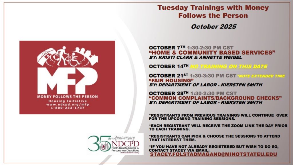 The Money Follows the Person (MFP) Housing Program helps people who are elderly or disabled to access decent, safe, and affordable housing. The MFP Housing Program team is tasked with finding decent, safe, affordable housing for persons who are MFP qualified and wish to transition out of institutions or nursing facilities and back into the community in the least restrictive setting possible. The MFP Housing Program staff includes a State Housing Facilitator (SHF) and four Consumer Housing Resource Specialists (CHRS) located in Minot, Grand Forks, Fargo, and Bismarck.