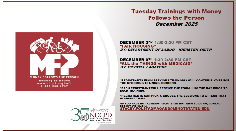 The Money Follows the Person (MFP) Housing Program helps people who are elderly or disabled to access decent, safe, and affordable housing. The MFP Housing Program team is tasked with finding decent, safe, affordable housing for persons who are MFP qualified and wish to transition out of institutions or nursing facilities and back into the community in the least restrictive setting possible. The MFP Housing Program staff includes a State Housing Facilitator (SHF) and four Consumer Housing Resource Specialists (CHRS) located in Minot, Grand Forks, Fargo, and Bismarck.